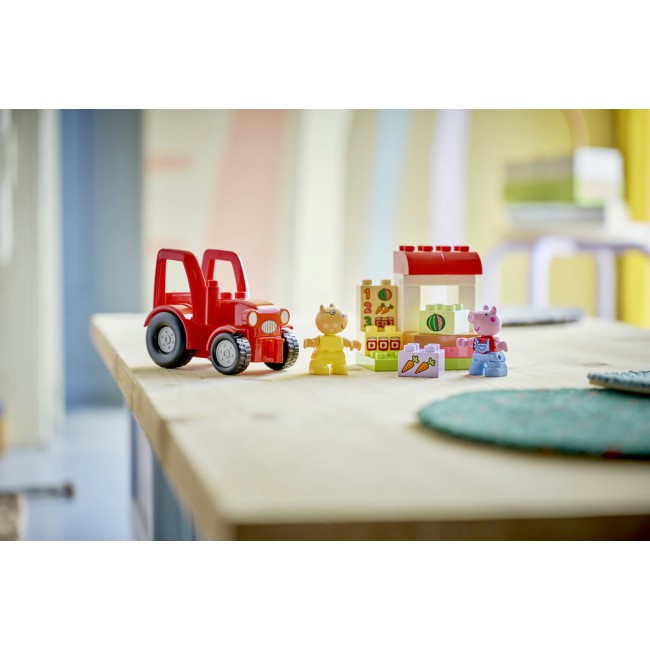 Help toddlers cultivate their creativity with the Peppa Pig Tractor and Market (10468) building toy. Toddlers aged 2 years old and over immerse themselves in imaginative play as they imitate running a farm shop and stocking it with the LEGO® DUPLO® bricks decorated with food items to sell. This pretend-play toy comes with Pedro Pony and Peppa Pig figures, a drivable red tractor and carrot, watermelon and jam jar bricks.